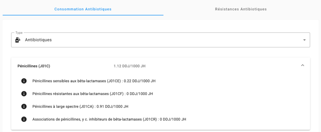 Cette navigation hiérarchique vous permet d’analyser la consommation des antibiotiques de manière progressive, du niveau global jusqu’au médicament individuel.